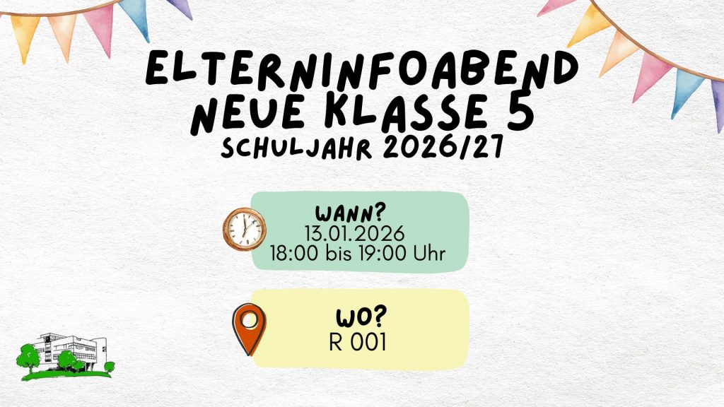 Wir laden alle interessierten Eltern herzlich zu unserem Elterninformationsabend für die neue 5. Klasse im kommenden Schuljahr 2026/27 ein. Die Veranstaltung findet am 13.01.2026 um 18:00 Uhr im Raum R 001 statt.